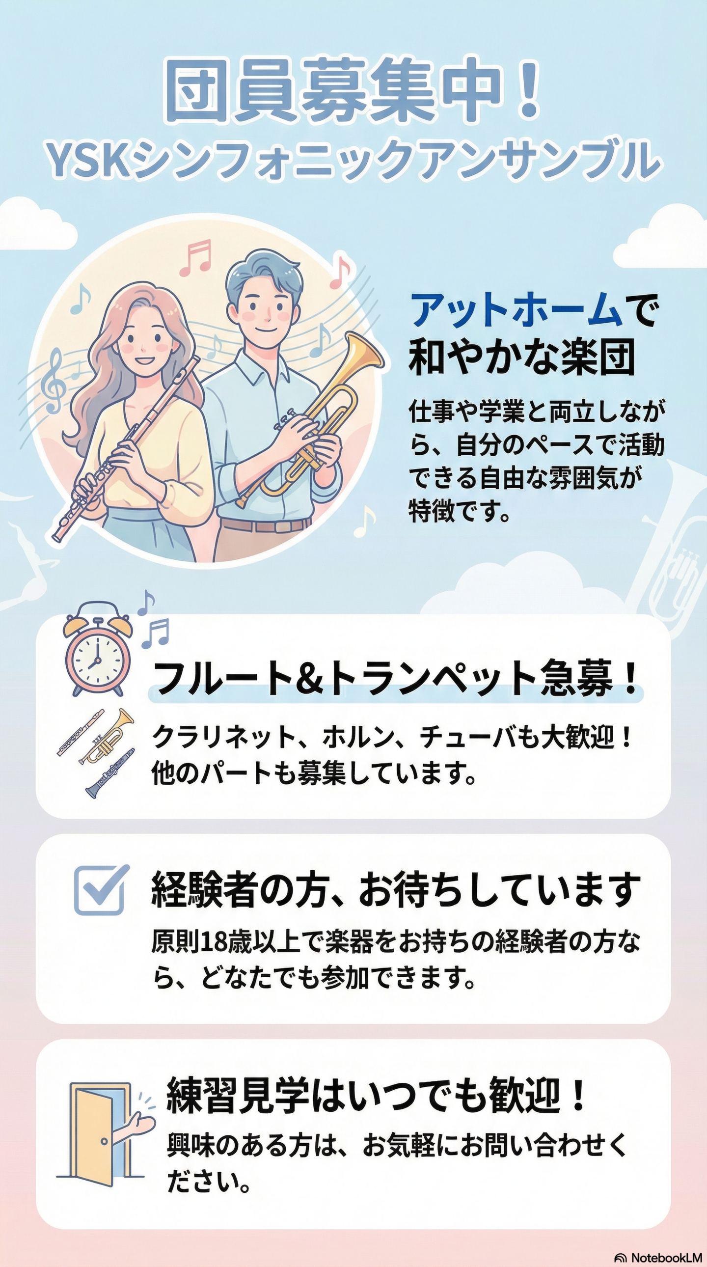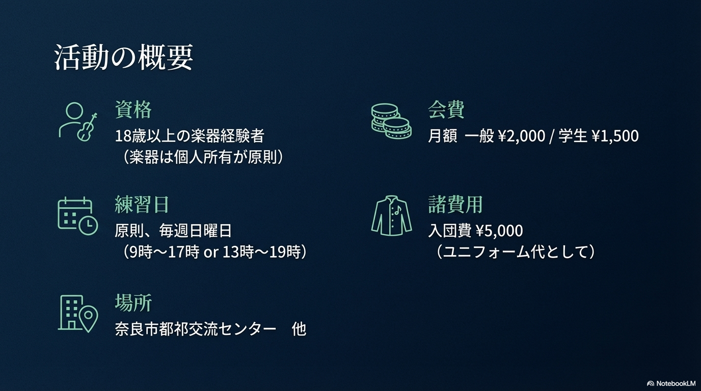 | 入団資格 | ◆原則的に18歳以上の楽器経験者 |