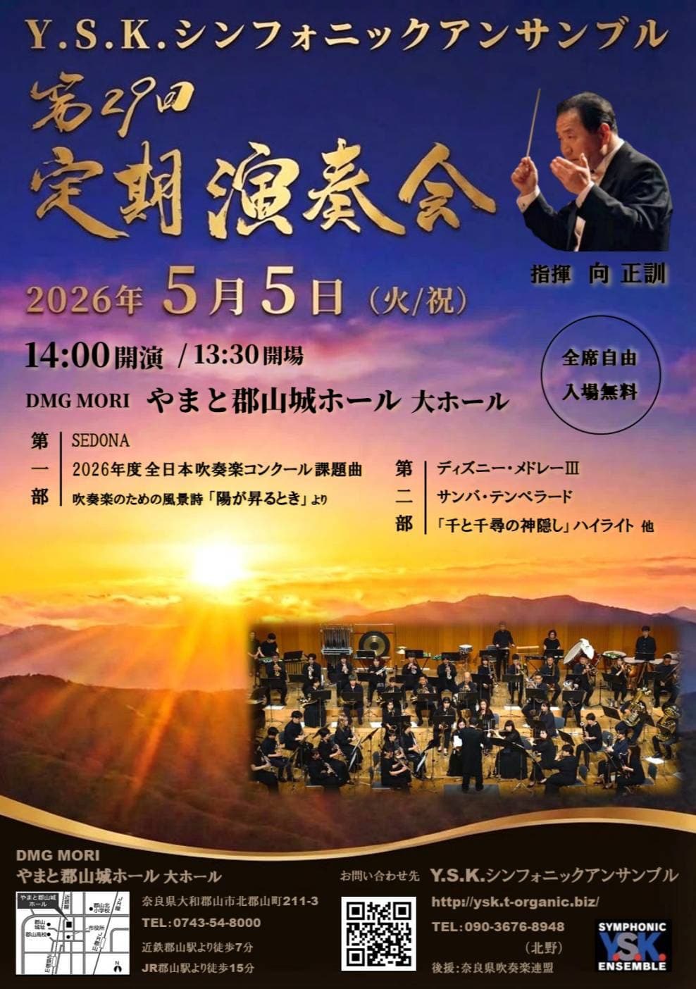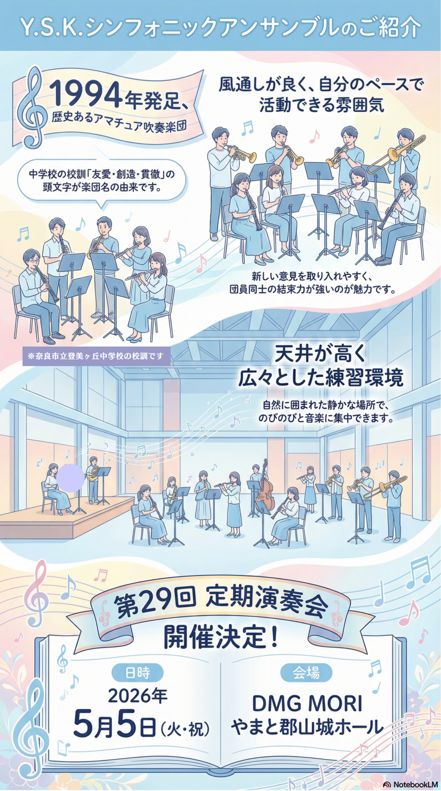 Y.S.K.シンフォニックアンサンブルは奈良市内で1994年に発足したアマチュア吹奏楽団です。Y.S.K.という名称は当楽団が『奈良市立登美ケ丘中学校吹奏楽部OB会』が発端で、中学の校訓である『友愛・創造・貫徹』の頭文字が由来となっています。